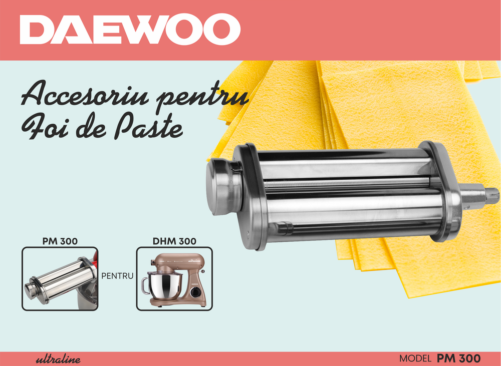 Pentru iubitorii de paste, dar si pentru pasionatii preparatelor sanatoase facute in casa, un aparat pentru foi de paste este extrem de util in bucatarie. Cu ajutorul acestuia cunosti cu exactitate ingredientele folosite la relizarea celor mai gustoase spaghetti sau tagliatelle. Acest accesoriu este compatibil cu mixerul cu bol DHM300 din aceeasi gama Daewoo.
