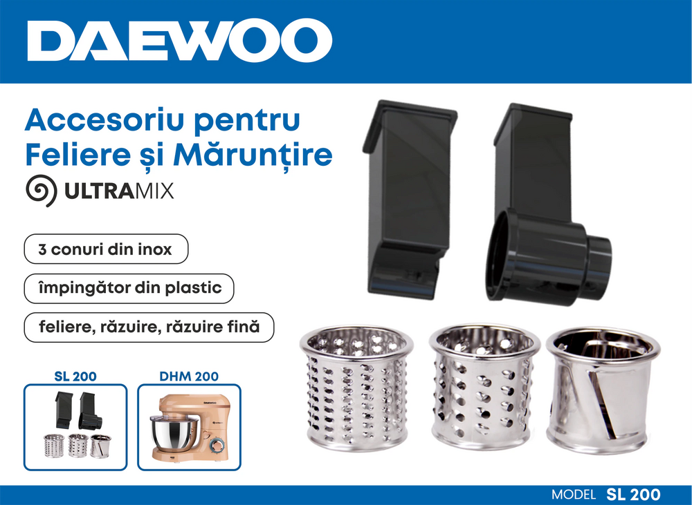 Adaugati cu usurinta ingrediente proaspete in toate salatele sau retetele dvs. preferate. Atasati accesoriul Daewoo SL200 la butucul de alimentare al mixerului DHM200 si feliati sau maruntiti rapid si fara efort legumele si mirodeniile proaspete.