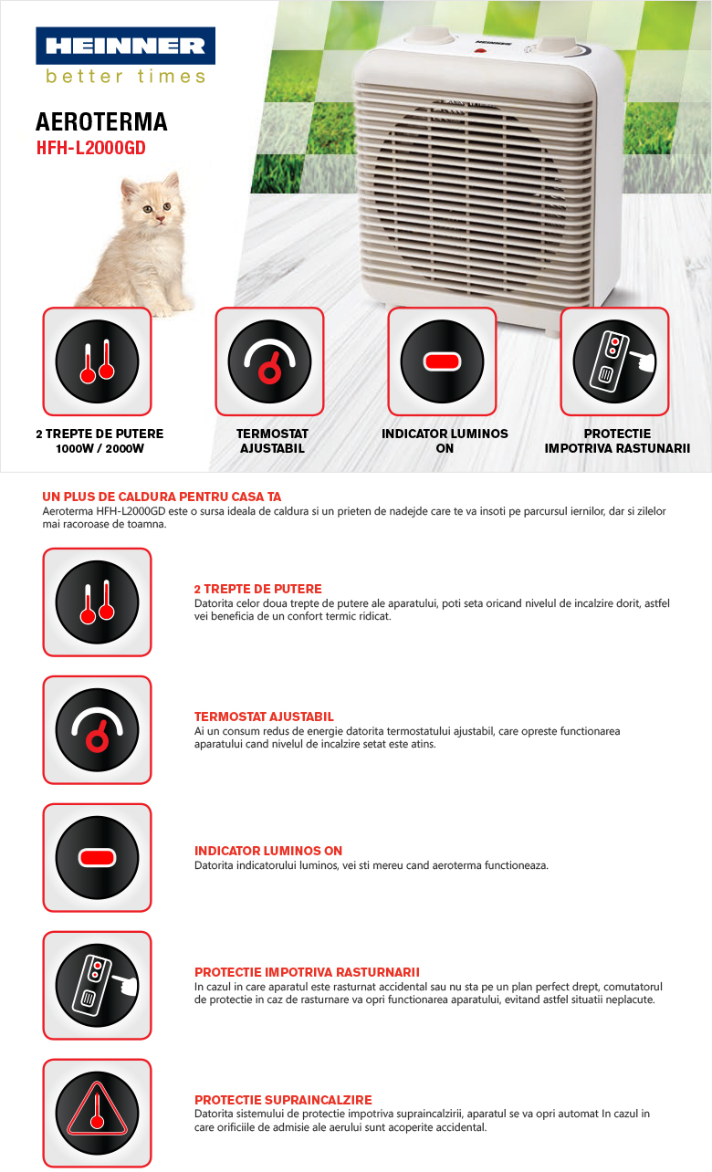 Aeroterma Heinner HFH-L2000GD, 2 trepte de putere: 1000/2000W, protectie supraincalzire, indicator luminos "ON", termostat ajustabil, protectie impotriva rasturnarii