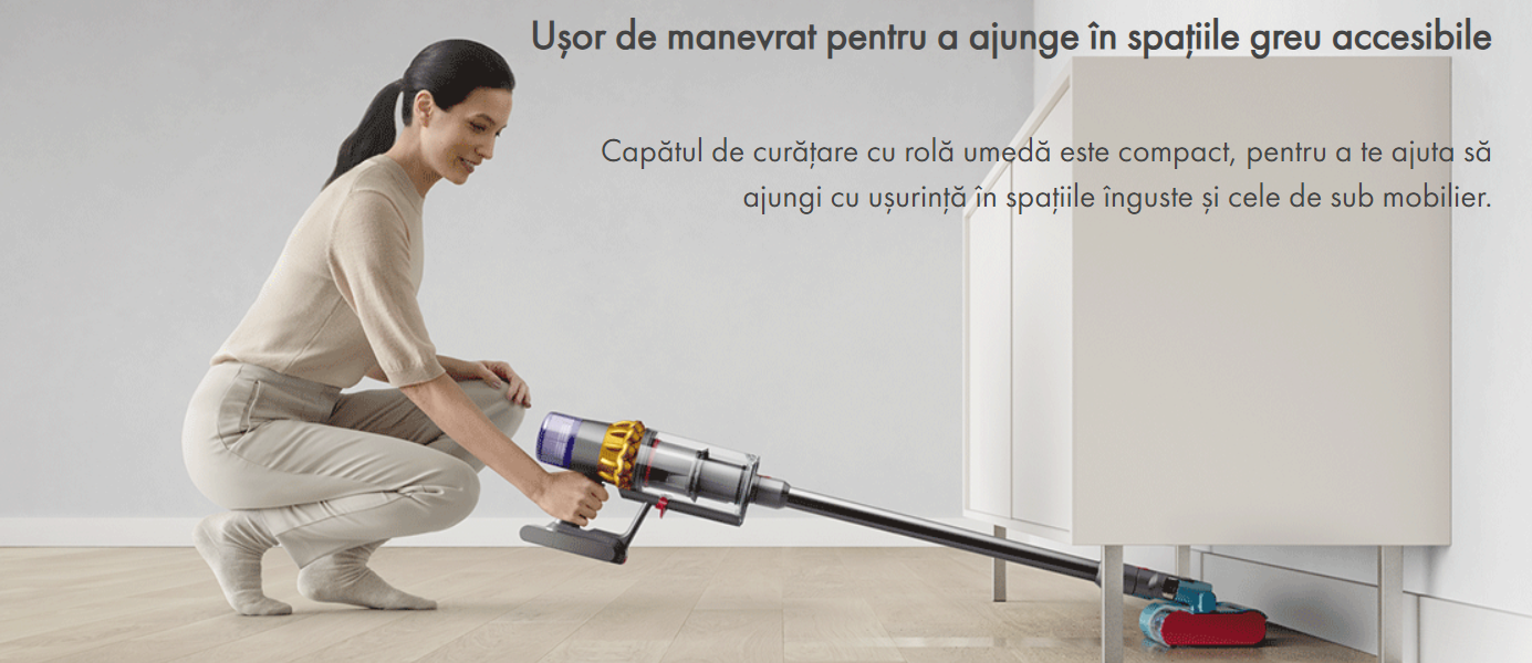 Compact și ușor de manevratPoți curăța murdăria de sub mobilă și din locurile mai puțin accesibile cu ajutorul capătului de curățare cu rolă umedă care are sub 10 cm înălțime. | ![]() |