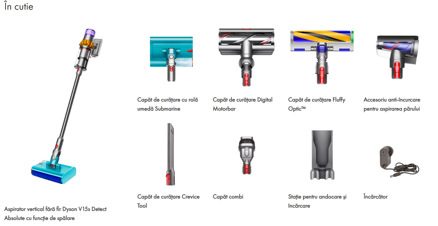 Accesorii incluse Capăt de curățare cu rolă umedă Submarine, Perie Digital Motorbar, Perie de curățare Fluffy Optic cu iluminare, Capăt anti-încurcare pentru aspirarea părului, Perie Combi 2în1, Crevice tool, Stație andocare și încărcare, Încărcător