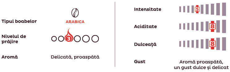 Boabele 100% Arabica selectate cu grija din cele mai importante plantatii de cafea din Brazilia si America Centrala confera acestui produs o aroma proaspata, un gust delicat, dulce si crema deosebit de fina. |