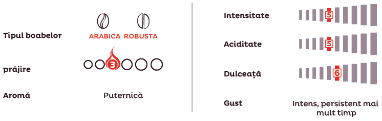 Acest amestec este o combinatie de cafele selectate din America de Sud, America Centrala si Asia – un amestec de cafele intense, atat ca aroma, cat si ca gust. Aroma este asemanatoare cu painea prajita iar aftertaste-ul aminteste de ciocolata neagra si de cacao. |