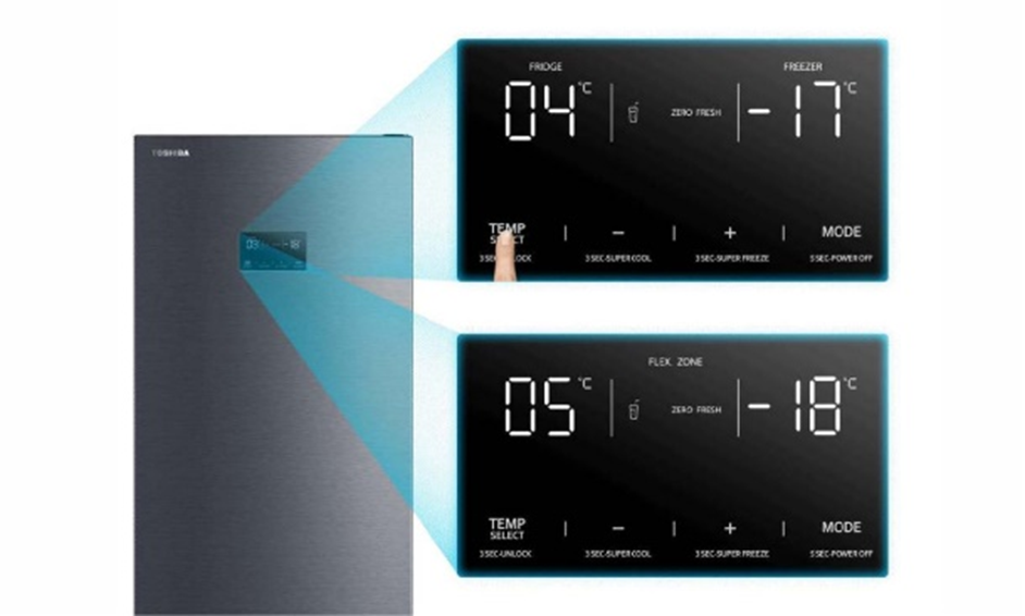 Aparatul frigorific este dotat cu ecran LED intuitiv, de la care pot fi setate temperaturile, atat la partea superioara, cat si la nivelul congelatorului. Mentineti in siguranta alimentele in combina frigorifica Toshiba.