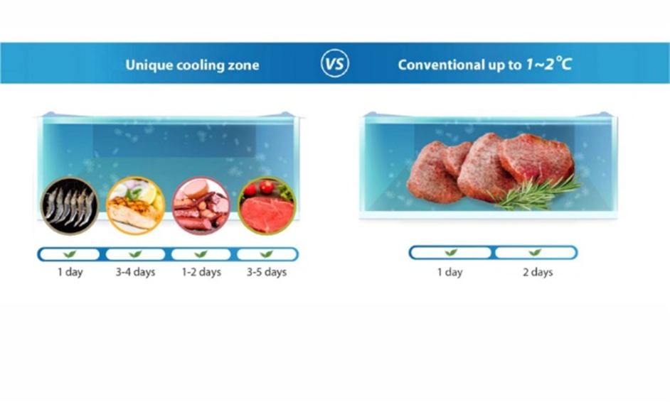 Zona de racire unica (-3°C - +2°C) pune la dispozitie niveluri diferite de conservare in functie de tipul de carne, tipul de aliment (fructe de mare sau carne) si le mentine proaspete, gata de preparare.