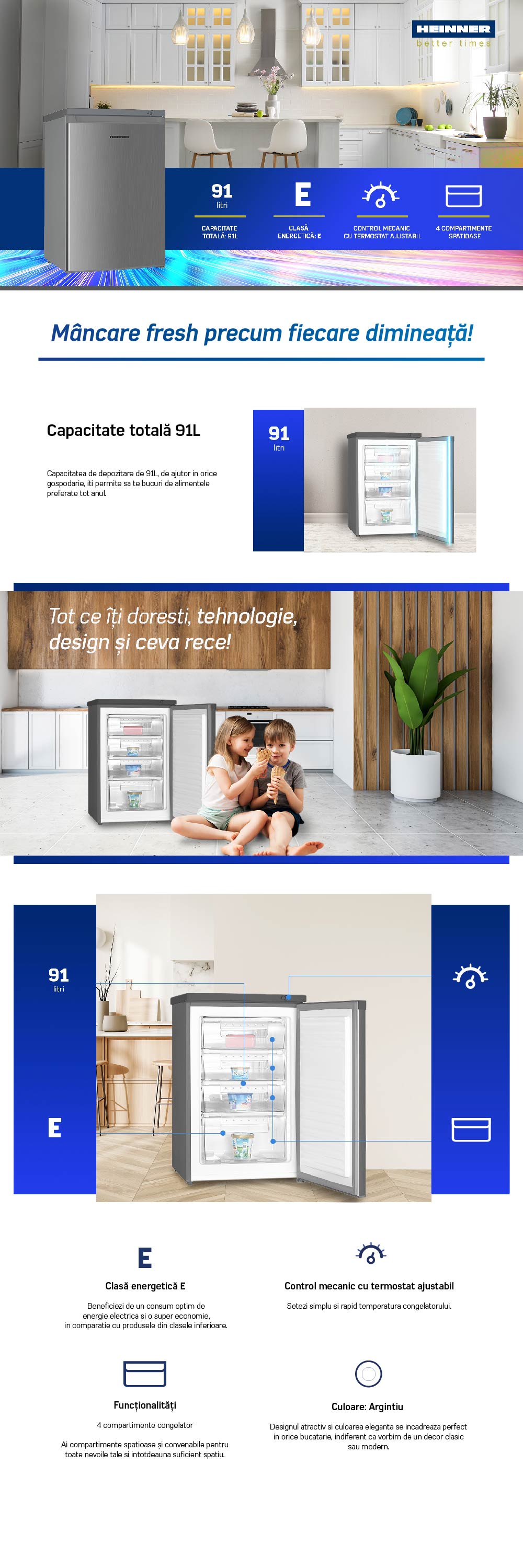 Opiniile clientilor despre Congelator Heinner HFF-HM91SE++, clasa E, 91l, usa reversibila, Argintiu