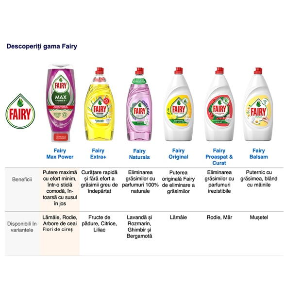 Detergentul de vase lichid Fairy Extra+ ofera o curatare rapida si fara efort cu puterea sa de eliminare a grasimii, in timp ce rasfata simturile cu aroma de citrice. Alege cea mai buna formula Fairy*, pentru eliminarea rapida a grasimii! *fata de toate celelalte produse Fairy din Romania. |