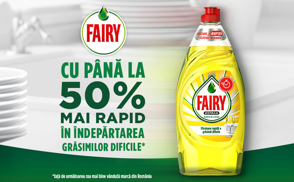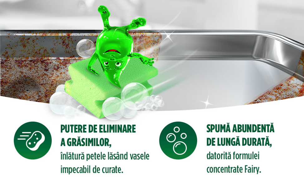 Spalarea cu Fairy Extra+ iti ofera o curatare rapida si eficienta, mai rapida decat folosind alte produse similare. Formula puternica distruge cu usurinta straturile de grasime si urmele de mancare arsa, oferindu-ti mai mult timp pentru a face lucrurile pe care le iubesti.