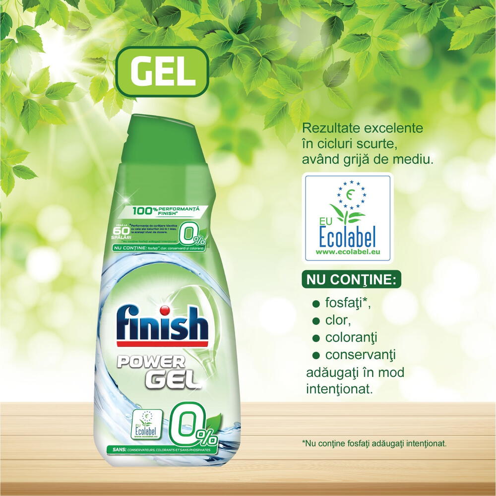 Datorita formulei cu dizolvare rapida, Finish Power Gel 0% aduce rezultate excelente in cicluri scurte, avand grija de mediu.
