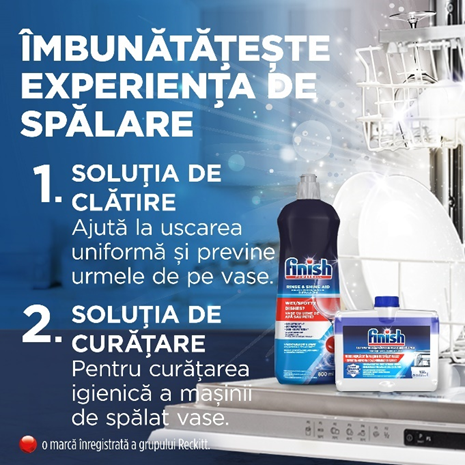 Pentru rezultate de curatare igienica, adauga in masina de spalat vase Solutia de Curatare Finish - o data la 3 luni, un ciclu de curatare fara vase.