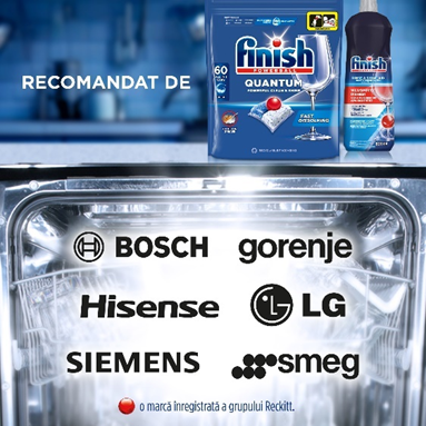 Detergentul de vase pentru masina de spalat Finish este recomandat de principalii producatori de masini de spalat vase.