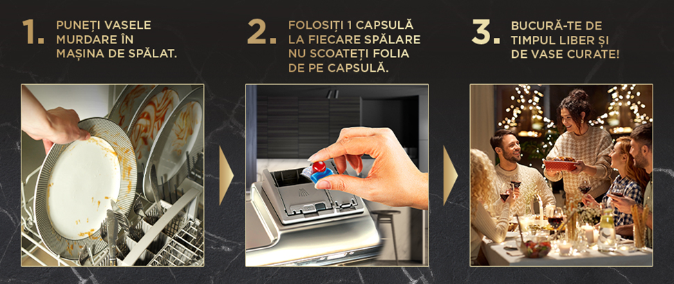 Nu se îndepărtează ambalajul. Acesta este un înveliș biodegradabil, 100% dizolvabil în apă.