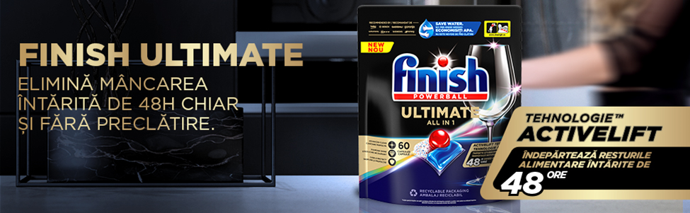 Cu ajutorul detergentului de vase Finish Ultimate, vasele tale vor primi ingrijirea si protectia de care au nevoie pentru a te bucura de ele cat mai mult timp! |