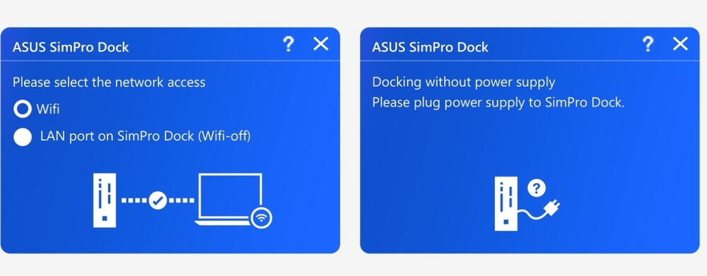 SimPro Dock 2 include software simplu si inteligent care te ajuta sa te instalezi. Mesajele pop-up simplifica suita de operatiuni necesara pentru conectare - cea la reteaua de internet, de exemplu. Dispozitivul va arata si un mesaj de alerta daca se intampla sa te conectezi fara sa ai dispozitivul alimentat.