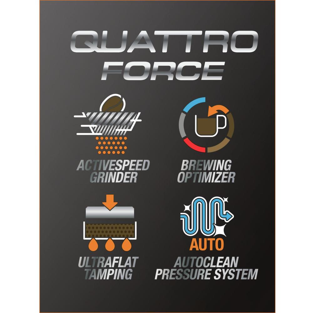 - Sistemul Krups Quattro Force optimizeaza fiecare etapa in procesul de obtinere a unui espresso de la boaba de cafea pana in ceasca: o rasnire cu 20% mai rapida, presare perfecta, sistem de extractie avansat al cafelei si golire automata a sistemului dupa fiecare utilizare pentru performante de durata.