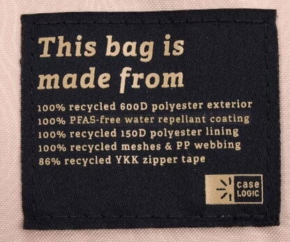 | Aceasta geanta este fabricata cu un exterior din poliester 600D 100% reciclat, captuseala din poliester 150D, ochiuri, chingi PP si banda de fermoar YKK reciclata in proportie de 86%. Invelisul hidrofug este, de asemenea, lipsit de PFC, substante chimice daunatoare pentru mediu | ![]() |