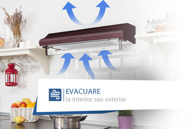 Pentru evacuarea la exterior motorul puternic atrage aerul in interior, particulele sunt retinute in filtrul metalic, iar mirosurile neplacute sunt eliminate in exterior cu ajutorul burlanului.