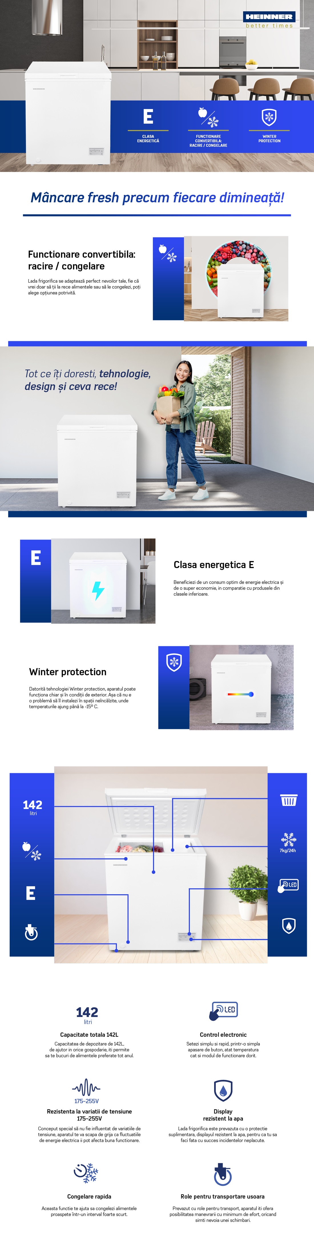 | Functii | Rezistenta la frig Display rezistent la apa Congelare rapida Functie conversie Frigider/Congelator |