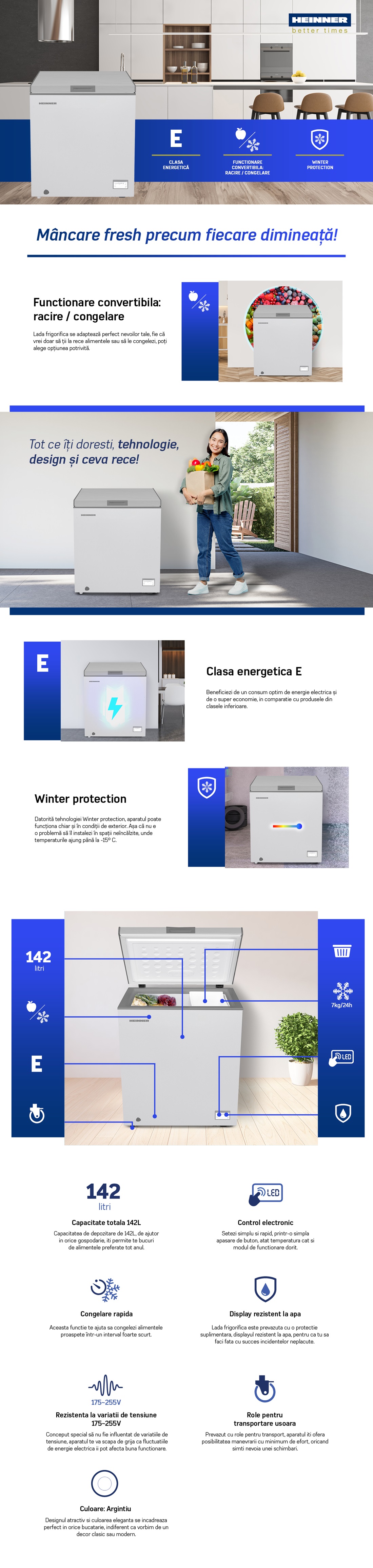 Opiniile clientilor despre Lada frigorifica Heinner HCF-HM145CSE++, 142 l, Clasa E, Convertibila Frigider/Congelator, Control electronic, Argintiu