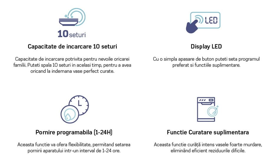 | Functii | Protectie impotriva inundatiilor Blocare acces copii Uscare Pornire programabila Incarcare la jumatate Cos superior ajustabil Deschidere automata a usii Cos pentru tacamuri |