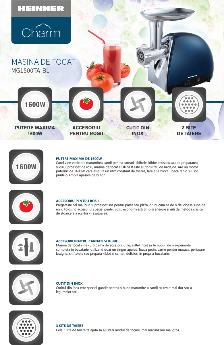 Opiniile clientilor despre Masina de tocat Heinner MG1500TA-BL, 1600 W, Accesoriu pentru rosii si carnati, Cutit inox, Albastru