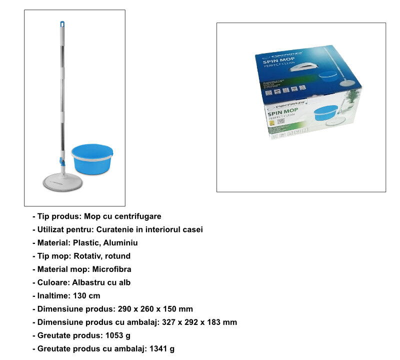 Cu Esperanza Spin Mop Perfect Clean, casa ta poate straluci doar intr-o secunda. Este potrivit pentru curatarea tuturor tipurilor de suprafete plane de podea.