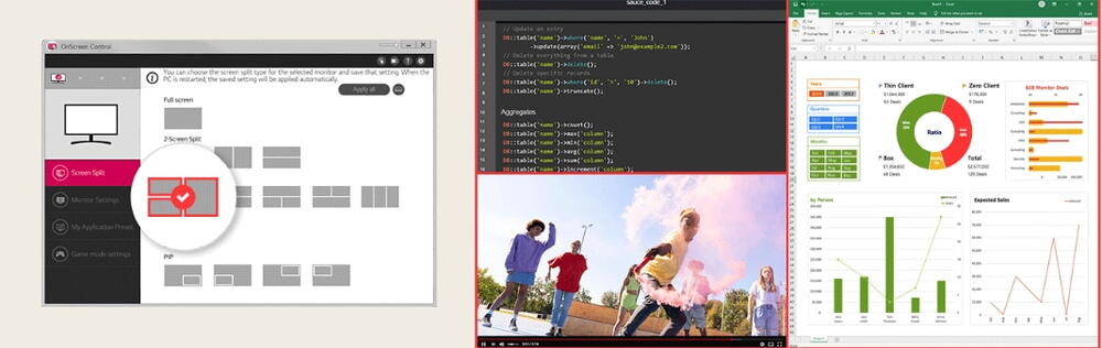 | Control simplificat Controlati cu usurinta setarile de afisare cu cateva clicuri folosind software-ul OnScreen Control. De asemenea, puteti imparti cu usurinta intreaga zona de afisare cu Screen Split. ![]() | |