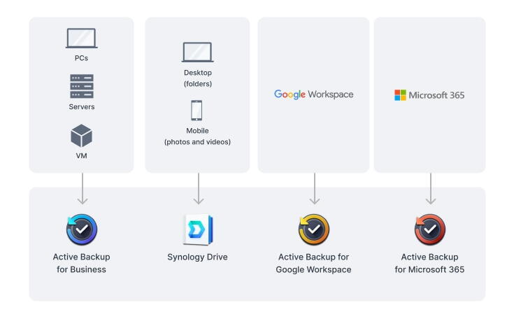 | Efectuati copii de rezerva pentru statii de lucru, smartphone-uri, aplicatii cloud si multe altele Consolidati si automatizati sarcinile de backup pentru statiile de lucru, serverele de fisiere, masinile virtuale, aplicatiile SaaS si multe altele cu Active Backup Suite. Administrati copiile de rezerva ale dispozitivelor de la distanta prin intermediul unui portal centralizat si restaurati rapid fisiere specifice sau dispozitive intregi pentru a va mentine afacerea in functiune. Profitati de solutiile integrate de backup de la distanta concepute pentru a va proteja datele cu configuratii de backup 3-2-1 fara intreruperi. | ![]() |