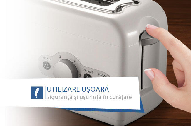 Introduci feliile de pâine, selectezi gradul de rumenire, apeși în jos de butonul lateral, iar pâinea începe să se prajească. Apeși pe STOP, procesul se întrerupe, iar feliile se ridică în mod automat.