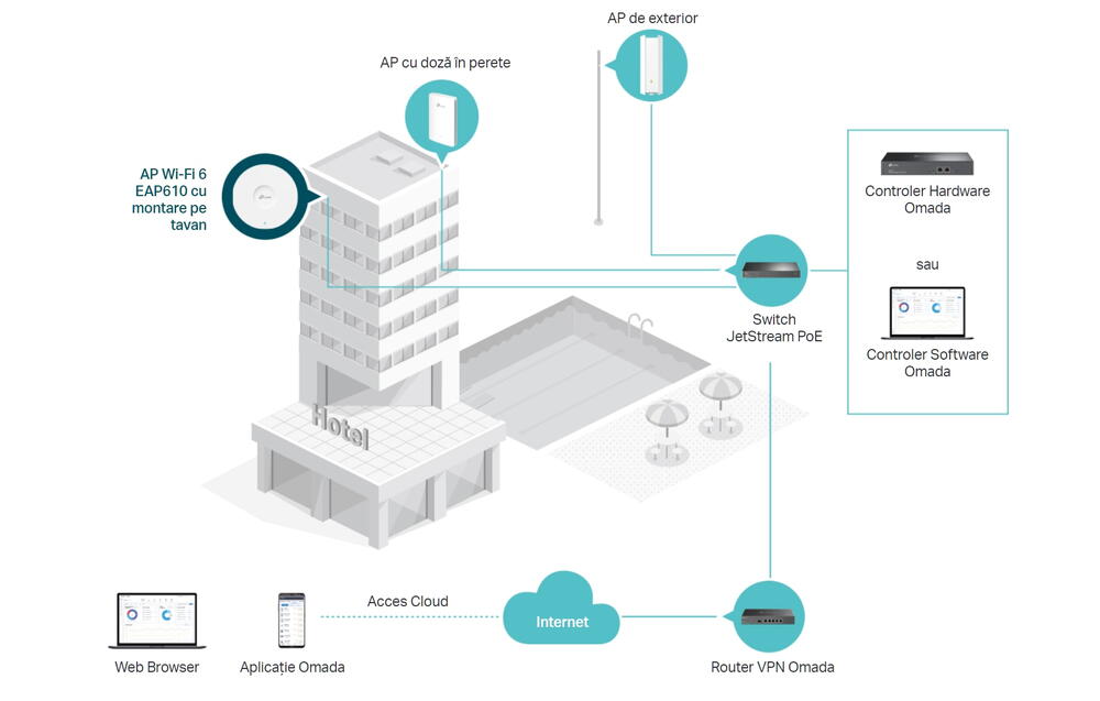 Platforma Omada Software Defined Networking (SDN) integreaza dispozitive de retea, inclusiv Access Point-uri, Switch-uri si Routere, oferind management cloud centralizat 100% si o retea scalabila - toate acestea controlate dintr-o singura interfata.
