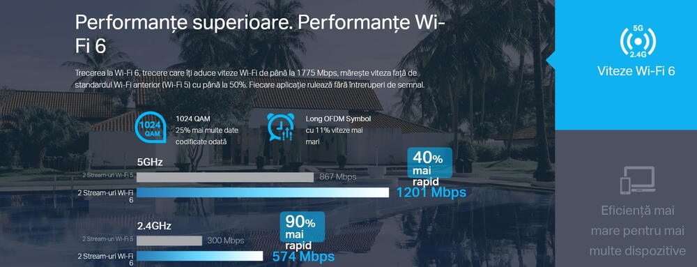 Tehnologia Wi-Fi 6 ofera viteze mai mari, mai putin lag si capacitate mai mare de conectare.