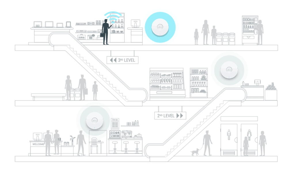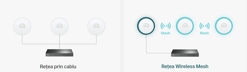 Cu tehnologia Mesh, EAP-urile Omada fac ca procesul de implementare sa fie mai usor, fara multe cabluri. Astfel ca reteaua este extinsa wireless in zonele in care implementarea prin cablu nu este accesibila.