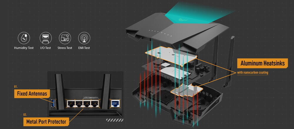 TUF Gaming AX3000 V2 este proiectat pentru a oferi performante WiFi maxime. Amplasarea orificiilor de ventilatie si designul radiatorului imbunatatesc racirea pentru o stabilitate sporita, iar antenele fixe si protectiile metalice ale porturilor sporesc durabilitatea fizica.