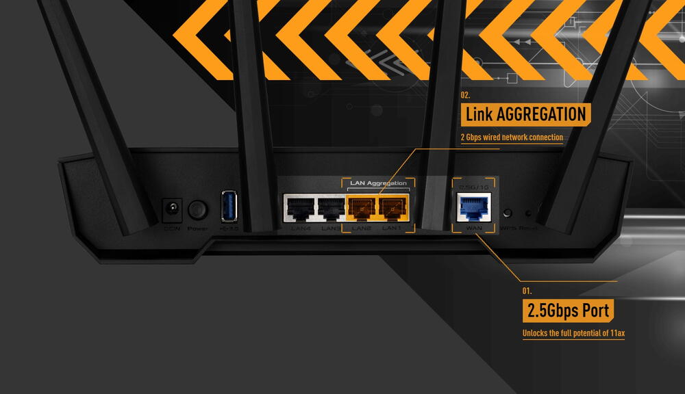 TUF Gaming AX3000 V2 poate debloca o latime de banda de internet de pana la 2Gbps prin portul de 2,5Gbps si agregarea a doua servicii de internet separate de 1Gbps folosind porturile LAN1 si LAN2.*