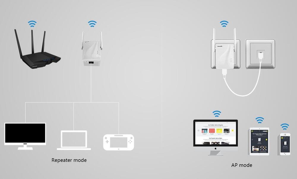 Tenda AC750 Dual Band WiFi Repeater, A15; Interface: 1* Megabit LAN Ethernet ports; Antenna: 2* 2dBi Omni-directional antennas; Wireless Standards: IEEE 802.11n/a/ac/ IEEE 802.11b/g/n; Frequency: 2.4GHz, 5GHz; Wireless Speed: 5GHz Up to 433Mbps/ 2.4GHz Up to 300Mbps; Power: Input - 100-240V—50/60Hz, 0.3A/ Output - 9V800mA.