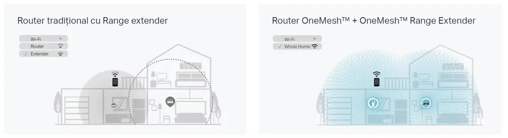 | Retea Mesh usor de obtinut Routerul OneMesh ™ si Range Extenderul OneMesh ™ se conecteaza instantaneu.