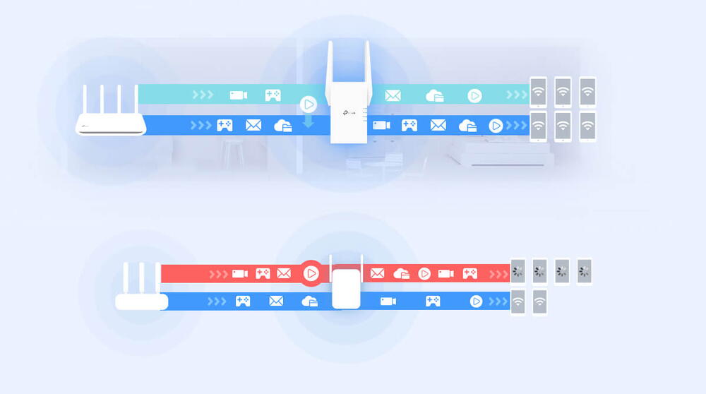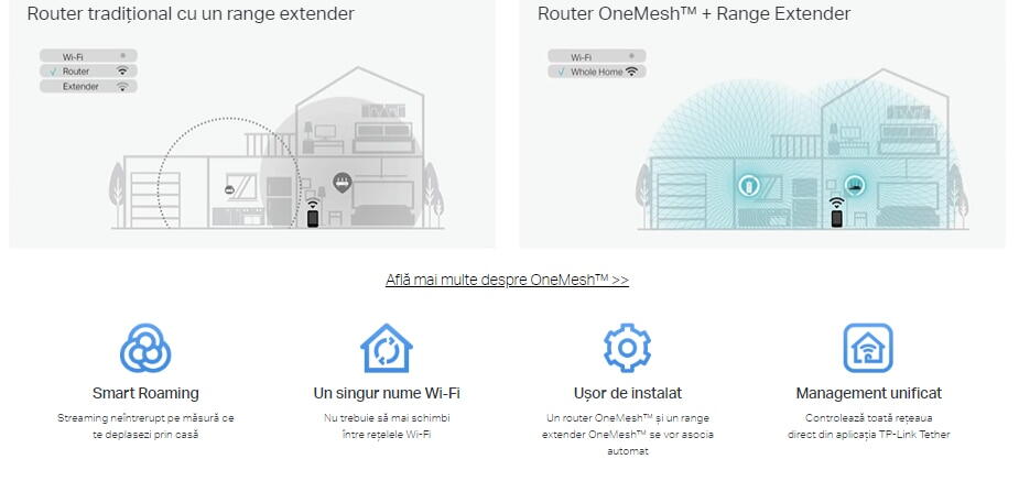 Tehnologia OneMesh™ este o metoda simpla de a crea o retea Mesh Wi-Fi, cu un singur nume si parola, pentru o acoperire extinsa si neintrerupta. Trebuie doar sa conectezi RE705X la un router compatibil cu tehnologia TP-Link OneMesh™.