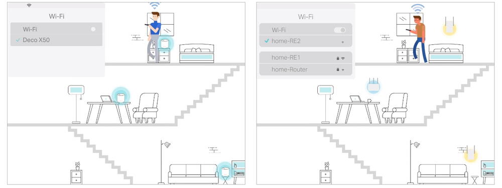 TP-Link Mesh inseamna ca unitatile Deco lucreaza impreuna pentru a forma o singura retea unificata. Telefonul sau tableta dvs. se conecteaza automat la cel mai rapid Deco, pe masura ce va deplasati prin casa, creand o experienta WiFi cu adevarat fara intreruperi.