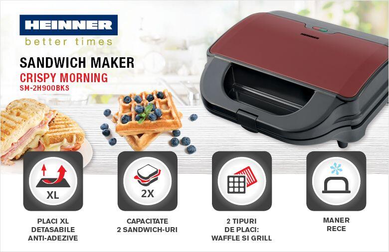 | Capacitate: 2 sandwich-uri Micul dejun este o adevarata placere daca ai la indemana sandwich maker-ul Heinner SM-2H900BKS. Acesta are o capacitate de 2 sandwich-uri si este foarte usor de manevrat. | ![]() |