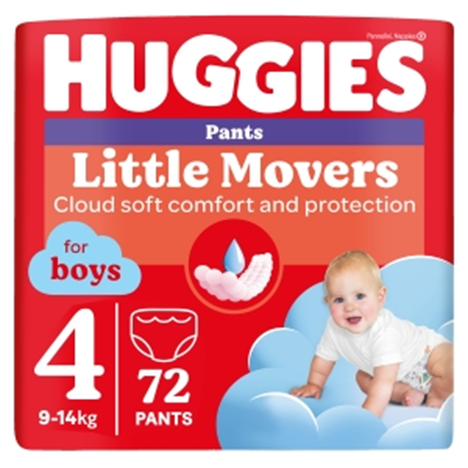 Cu aparatori duble pentru o protectie suplimentara impotriva scurgerilor si cu o banda in talie moale ca un norisor, chiloteii Huggies® Little Movers te mentin uscat si confortabil pana la 12 ore, fie ca este zi sau noapte.
