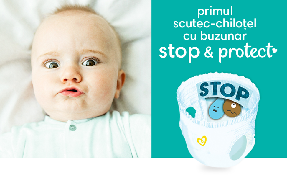 Scutecele-chilotel Pampers Pants sunt primele scutece-chilotel cu buzunar Stop & Protect care, in combinatie cu fixarea de jur-imprejur, ofera protectie impotriva scurgerilor de orice fel de pana la 12 ore. De asemenea, au un nucleu superabsorbant care absoarbe umezeala instantaneu si mansete duble pentru picioare ce ajuta la prevenirea scurgerilor in jurul picioarelor.