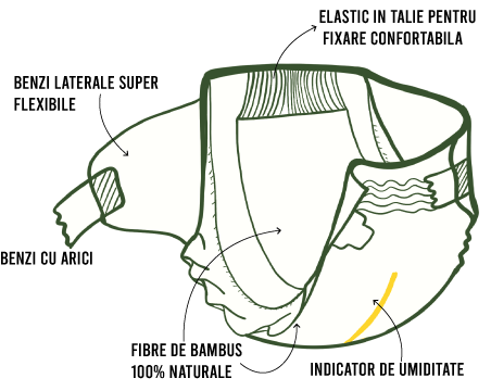 Fibre de bambus moi si naturale - am refuzat sa folosim plastic in produsul nostru acolo unde nu era neaparat necesar – am inlocuit plasticul din invelisul scutecelor clasice cu bambus moale si catifelat. Lasa pielea sa respire si se simte pe piele fix ca o hainuta moale.