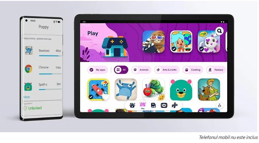 Spatiul Google Kids de pe tabletele Lenovo ii ajuta pe copii sa descopere, sa creeze si sa se dezvolte cu o biblioteca de continut de calitate si recomandari pentru ca copiii sa isi exploreze cele mai recente fascinatii in moduri noi si captivante. Ghidati experienta copilului dvs. gestionand continutul si setand limite de timp pe ecran de pe propriul dispozitiv cu controlul parental in aplicatia Family Link.