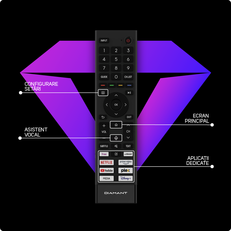 Pentru o interactiune mai facila cu aplicatiile din platforma VIDAA a televizorului DIAMANT, ai butoane dedicate pentru cele mai populare aplicatii SMART, precum NETFLIX, Prime Video, YouTube si Plex. De asemenea, butoanele sunt asezate intr-un mod intuitiv, cu acces usor si rapid la toate facilitatile televizorului.