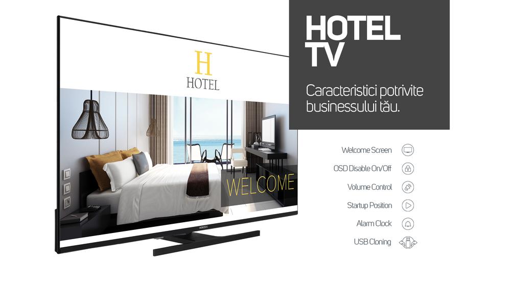 Alege caracteristicile Hotel TV Mode (Passive) potrivite business-ului tau. Cu ajutorul parolei unice si al telecomenzii televizorului inteligent 4K UHD de la HORIZON, ai acces la functiile avansate de management asupra imaginilor si mesajelor de intampinare afisate pe TV, ce furnizeaza o diferentiere sporita in industria hoteliera. Mai mult, toate setarile realizate de tine pot fi copiate pe alte televizoare (USB cloning), dar si securizate astfel incat sa poti limita accesul persoanelor neautorizate (OSD Disable On/Off).