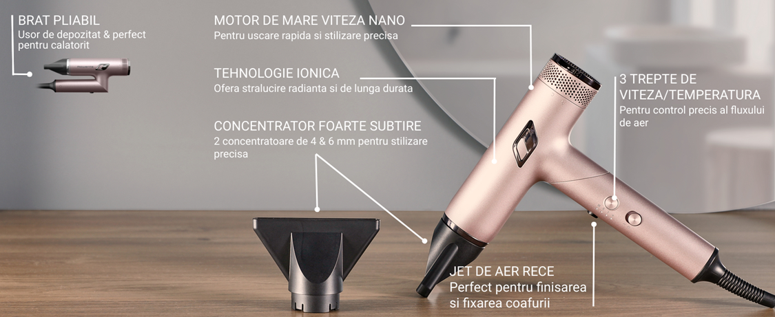 Designul elegant ofera performanta perfecta de uscare intr-un format cu 70%* mai compact, pentru o experienta de stilizare mai usoara.