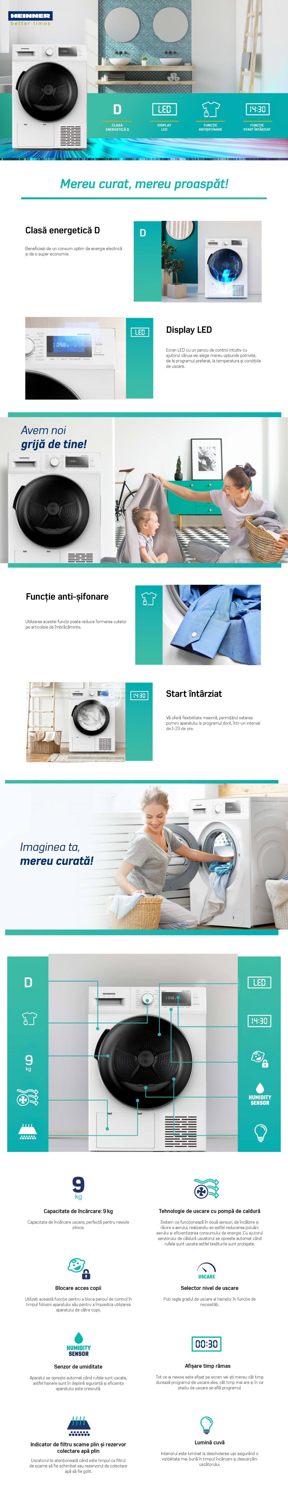 USCATOR DE RUFE CU POMPA DE CALDURA HEINNER HHPD-M9G3A++, CAPACITATE INCARCARE 9KG, CLASA ENERGETICA D, 14 PROGRAME DE USCARE, DISPLAY LED, PROGRAM RAPID CAMASI, FUNCTIE START INTARZIAT, FUNCTIE ANTI-SIFONARE, LUMINA CUVA, SELECTOR NIVEL USCARE, INDICATOR CURATARE FILTRU SCAME, INDICATOR REZERVOR COLECTARE APA PLIN, BLOCARE ACCES COPII, DIMENSIUNI ( LXAXI): 59.5X60X84.5 CM, CULOARE: ALB