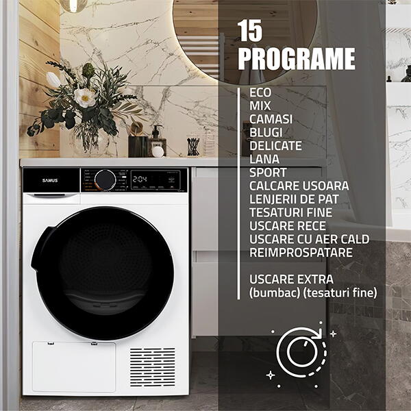 Fa-ti viata mai usoara! Cu uscatorul de rufe Samus, spalatul rufelor nu mai este o corvoada. Te bucuri de confort, economie de timp si o eficienta de top. Hainele tale vor fi gata de purtat rapid si fara efort, iar tu ai mai mult timp pentru ceea ce conteaza cu adevarat. Alege acum solutia moderna pentru o casa ordonata si rufe perfect uscate!