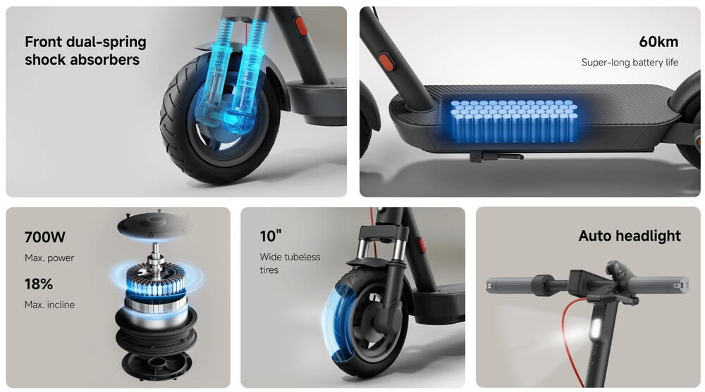 Dispunand de anvelope fara camera de 10 inci de 60mm*, cu etansare sporita si absorbtie a socurilor, scuterul faciliteaza calatorii mai sigure si mai stabile, deoarece suprafata mai mare de contact cu solul imbunatateste tractiunea din timpul virajelor.