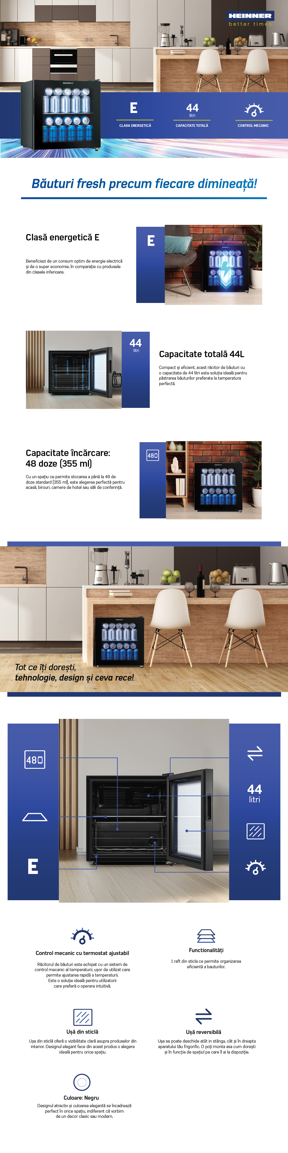 Opiniile clientilor despre Racitor de bauturi Heinner HBC-M44BKE, clasa E, capacitate totala: 44L, capacitate incarcare: 48 doze (355 ml), 1 raft din sticla, usa reversibila, Negru